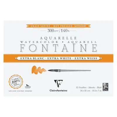 Clairefontaine Fontaine 976019C Watercolour Paper Pad Extra White and Satinised 4 Sided Glued 15 Sheets 300 g 26 x 18 cm Pack of 1