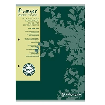 STUDENT BLOCK: glued on the long side with tear-off sheets and 2-hole punched LARGE FORMAT: the standard, for extra note making 100% RECYCLED SURFINE PAPER 70 g/m²: without de-inking, without optical brighteners, or chlorine treatment, with natural whiteness. Certified by the Blue Angel label COVER: recycled card RIGID CARDBOARD: for comfortable note taking, even without support PEFC CERTIFIED: for sustainable forest management Made in France