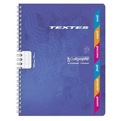 SET OF 10 NOTEBOOKS: ideal for school lists, schools and communities. SMALL SIZE: school size, easy to store in schoolbag COVER: varnished recycled coated card. AVAILABLE COLOURS: blue, sky blue and red REINFORCED DOUBLE SPIRAL: allows full aperture, ideal for double-sided use of sheets PAPER: white vellum 70 g/m², the best value for money. TRICOLOR SETTING: red margin, purple lines and blue line spacing, for greater writing comfort. REMOVABLE COLOUR KEYS: for days of the week. MADE IN FRANCE and PEFC CERTIFIED: for sustainable forest management