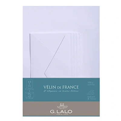 Clairefontaine Ref 63000L G.Lalo Correspondence Set 10 x A4 (21 29.7cm) 100gsm Sheets + 5 Gummed Lined DL (11 22cm) Envelopes Vellum de FR White