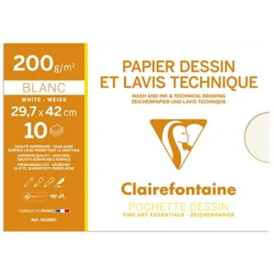SCHOOL DRAWING POCKET: this drawing paper pocket is THE must-have back-to-school pocket! SMOOTH WHITE PAPER: this white drawing paper has a smooth, slightly grained surface, ideal for multiplying creative activities! DEDICATED TO WASH: thick and resistant, this paper is suitable for pencil or pen drawings but also for more or less diluted and superimposed ink washes. FORMAT A3: this pocket of 10 sheets of drawing paper is resealable. It is easy to transport and allows you to protect and keep the drawings away from light and dust. MADE IN FRANCE: this pouch is made in the Vosges. The paper is acid-free and PEFC certified, for sustainable forest management. FINE ARTS SPECIALIST PAR EXCELLENCE: Clairefontaine Rhodia offers high-quality products adapted to your needs and to all drawing techniques.
