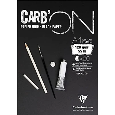 CARB'ON PAPER NOIR 120g: this deep black paper is dyed in the mass and perfectly resistant to light. FINE GRAIN: its lightly grained surface is ideal for contrast work and precise drawing. DRY TECHNIQUES: this paper is designed for drawing in pencil, chalk, red chalk, pastel or pigmented marker. It will lend itself perfectly well to highlights with white ink or gouache. FORMAT A4 - 21x29.7cm: 20 glued sheets allows you to keep your works or easily detach them without tearing them. ACID-FREE: this paper is acid-free and has a neutral pH for perfect preservation of the drawings over time. FINE ARTS SPECIALIST PAR EXCELLENCE: Clairefontaine Rhodia offers high-quality products adapted to your needs and to all drawing techniques.