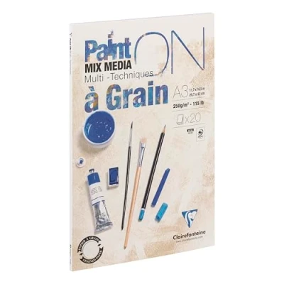 Clairefontaine Ref 975050C Paint'ON Multi Technique Paper with Grain Glued Pad (20 Sheets) A3 Size, 250gsm Heavyweight Paper, Extra White Acid Free, pH Neutral