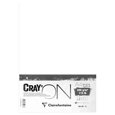 Clairefontaine Ref 975067C Cray'On White Sketch Paper (Pack of 50 sheets) A4 (21 x 29.7cm) Size, 200gsm 100% Cellulose Paper, Grained One Size & Smooth Other Side
