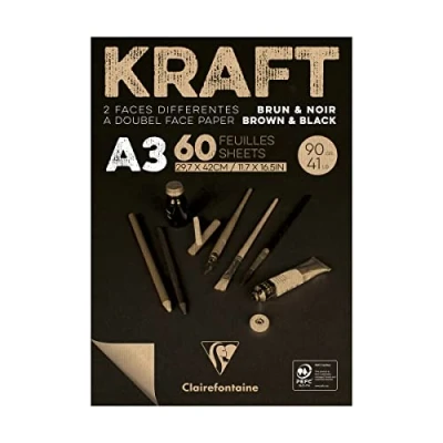 TWO-SIDED KRAFT PAPER: this two-colour Kraft paper 90g and its two surfaces, each in a different shade, gives even more depth to the creations! A BROWN SIDE: its first brown side is ideal for pencil drawing because it perfectly grips the pigments. A BLACK SIDE: its second black side is a perfect base for Indian ink or gouache creations. Its tint will give a beautiful depth to light colours. A3 FORMAT: this glued block header makes it easy to detach the sheets without tearing them. In addition, this paper is also printable in offset, digital and inkjet. ACID-FREE: this PEFC-certified paper is acid-free and pH-neutral for perfect preservation over time. It is 100% biodegradable and 100% recyclable. FINE ARTS SPECIALIST PAR EXCELLENCE: Clairefontaine Rhodia offers high-quality products adapted to your needs and to all drawing techniques.