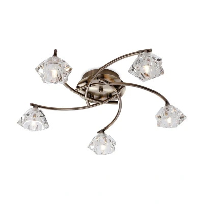 Clara 5 Light Flush Multi Arm Ceiling Antique Brass, Clear Glass, G9