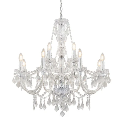 A 12 light chandelier with clear acrylic beading, facets and droplets. Comes with a fully adjustable chain to extend the drop of the light up to a maximum 1.8m. Also available in 2 sizes