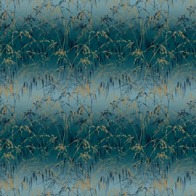Bring a summer evening feel to your interior with this design, featuring strands of meadow grass in a soft gold metallic hue gracefully moving across the paper on a ombré background. Shown here in the teal & soft gold colourway - other colourways available.