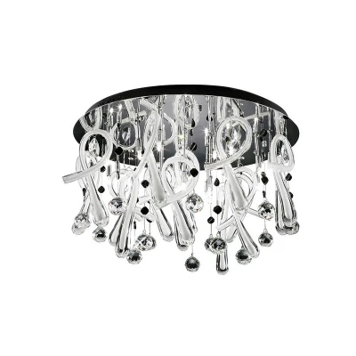 A stunning range of round and square Polished Chrome flush fittings. They are dressed with sizable looped hand crafted clear glass that has either White or Black gloss resin filled within. Strings of Asfour crystal spheres and contrasting glass stones are suspended through the fixtures in harmony with the looped glass. The final effect is exquisite. Compatible dimmer switches are available upon request.