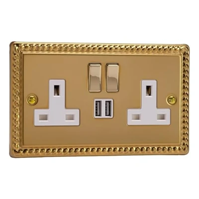 Double 13A switched socket with brass rockers, white insert and USB-A charging (2 × 12W shared) Elegant and versatile: brass rocker socket with white insert and USB-A charging for everyday convenience Georgian Brass pairs an elegant rope-edged design with a rich brass finish for a look that feels both traditional and refined. A timeless choice, Georgian Brass adds classical character and enduring style to interiors of every kind Proudly designed and manufactured in Great Britain, with reliability you can count on — backed by a Lifetime Guarantee