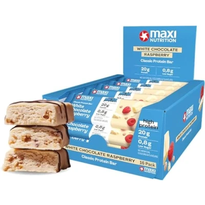 Classic protein Bar White Chocolate Raspberry 40g, 20g per bar, 142 kcal, 3.8g fat 16 x 40g bars,