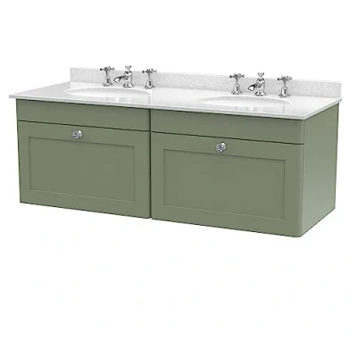 Eye catching and elegant, the Classique range of bathroom furniture from nuie combines Victorian inspired design with a contemporary twist. The traditional design is complemented in 5 modern colourways, with a large variety of different basins and worktops - to find the perfect unit for your bathroom. This space saving wall hung double vanity unit will endure as a much loved piece in your bathroom. With 2 soft close Shaker style drawer and ample storage for the essentials to be kept tidily away. In a relaxing Satin Green finish with light Chrome handles. Supplied rigid for easier installation. With a Marble top with double 3 tap hole high quality vitreous china ceramic white basins. Manufactured from high quality materials and manufactured to our highest standards. Matching furniture available in the Classique furniture range from nuie for a beautifully traditional design in your bathroom. Tap and waste not included. DIMENSIONS - H: 509mm, W: 1220mm, D: 470mm 5 year manufacturer's guarantee, Weight: 144.40278161 Pounds, Manufacturer: nuie