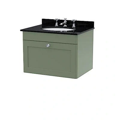 ManoManoGeneral description The Nuie Classique Satin Green 600mm Wall Hung Single Drawer Vanity Unit combines traditional elegance with modern functionality. Its stunning satin green finish exudes sophistication, making it an ideal choice for both contemporary and classic bathroom designs. Featuring a luxurious black marble countertop, this vanity unit not only elevates the aesthetic of your space but also offers a durable surface that is easy to clean and maintain. The round ceramic basin, complete with three tap holes, is perfectly integrated into the design, allowing you to choose your desired taps for a customized look. This vanity unit boasts a single soft-close drawer, providing ample storage for your bathroom essentials while maintaining a tidy appearance. The polished chrome handle adds a touch of refinement and ensures easy access to your belongings. Designed with practicality in mind, the wall-hung style frees up floor space, giving your bathroom a more spacious feel. The Nuie
