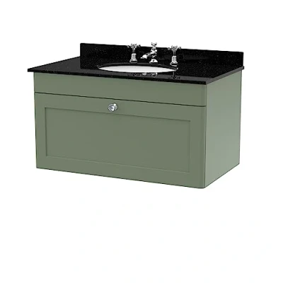 Classique Satin Green 800mm Wall Hung Single Drawer Vanity Unit with Black Marble Countertop and Round Basin 3 Tap Holes CLC896BR3 Nuie