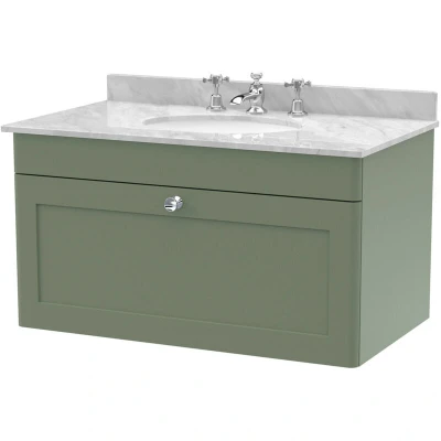 Classique Satin Green 800mm Wall Hung Single Drawer Vanity Unit with Grey Marble Countertop and Round Basin 3 Tap Holes CLC896GR3 Nuie