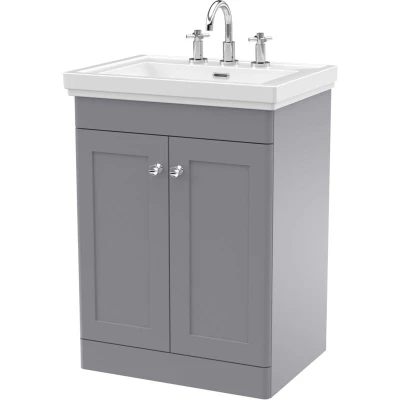 Classique Satin Grey 600mm 2 Door Vanity Unit and Classic Fireclay Basin with 3 Tap Holes CLC225B Nuie