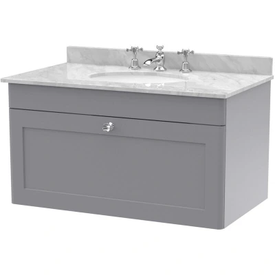 Classique Satin Grey 800mm Wall Hung Single Drawer Vanity Unit with Marble Countertop and Round Basin 3 Tap Holes CLC296GR3 Nuie