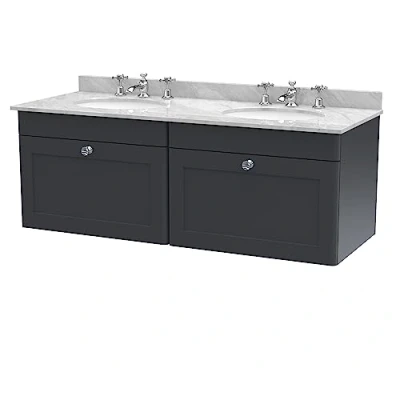 Eye catching and elegant, the Classique range of bathroom furniture from nuie combines Victorian inspired design with a contemporary twist. The traditional design is complemented in 5 modern colourways, with a large variety of different basins and worktops - to find the perfect unit for your bathroom. This space saving wall hung double vanity unit will endure as a much loved piece in your bathroom. With 2 soft close Shaker style drawer and ample storage for the essentials to be kept tidily away. In a striking Soft Black finish with light Chrome handles. Supplied rigid for easier installation. With a Marble top with double 3 tap hole high quality vitreous china ceramic white basins. Manufactured from high quality materials and manufactured to our highest standards. Matching furniture available in the Classique furniture range from nuie for a beautifully traditional design in your bathroom. Tap and waste not included. DIMENSIONS - H: 509mm, W: 1220mm, D: 470mm 5 year manufacturer's guarantee, Weight: 144.40278161 Pounds, Manufacturer: nuie