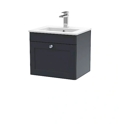 Eye catching and elegant, the Classique range of bathroom furniture from nuie combines Victorian inspired design with a contemporary twist. The traditional design is complemented in 5 modern colourways, with a large variety of different basins and worktops - to find the perfect unit for your bathroom. This space saving wall hung vanity unit will endure as a much loved piece in your bathroom. With 1 soft close Shaker style drawer and ample storage for the essentials to be kept tidily away. In a striking Soft Black finish with light Chrome handles. Supplied rigid for easier installation. With a 1 tap hole high quality vitreous china ceramic Minimalist white basin. Manufactured from high quality materials and manufactured to our highest standards. Matching furniture available in the Classique furniture range from nuie for a beautifully traditional design in your bathroom. Tap and waste not included. DIMENSIONS - H: 449mm, W: 505mm, D: 395mm 5 year manufacturer's guarantee, Weight: 53.351867404 Pounds, Manufacturer: nuie