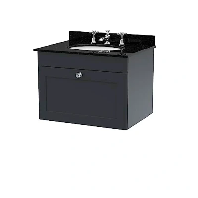 ManoManoGeneral description This Nuie Classique Satin Soft Black 600mm Wall Hung Single Drawer Vanity Unit is a striking fusion of traditional elegance and modern practicality. Its rich soft black finish and sophisticated black marble countertop enhance any bathroom, while the round ceramic basin with three tap holes is perfect for a contemporary three-tap basin mixer, allowing for tailored water flow. The soft close mechanism on the drawer ensures smooth, quiet operation, optimizing storage space for bathroom essentials. The wall-mounted structure creates a sleek look, making cleaning beneath it effortless, and the robust MDF construction guarantees durability. Technical specifications Model Number: CLC1494BR3 Vanity Unit Dimensions: W:600mm x H:431mm x D:453mm Countertop Dimensions: W:620mm x H:268mm x D:463mm Other information Basin tap and waste sold separately unless specified.