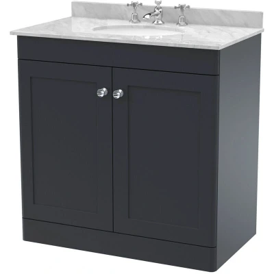 Classique Satin Soft Black 800mm 2 Door Vanity Unit with Grey Marble Countertop and Round Basin 3 Tap Holes CLC1426GR3 Nuie