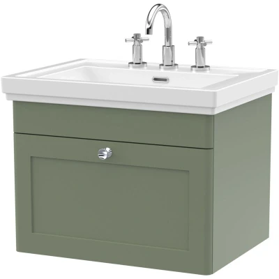 Classique Wall Hung 1 Drawer Vanity Unit with Basin 600mm Wide Satin Green 3 Tap Hole Nuie