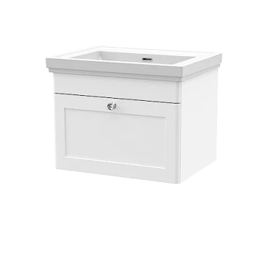 Classique Wall Hung 1 Drawer Vanity Unit with Classic Basin 600mm Wide Satin White 0 Tap Hole Nuie