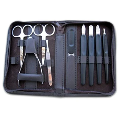 10-pcs manicure set with zipper Stainless steel instruments Tweeser, sapphire file, nail scissors, cuticle scissors, nail nipper, nail clipper and 4 instruments Leather case Colour: darkbrown