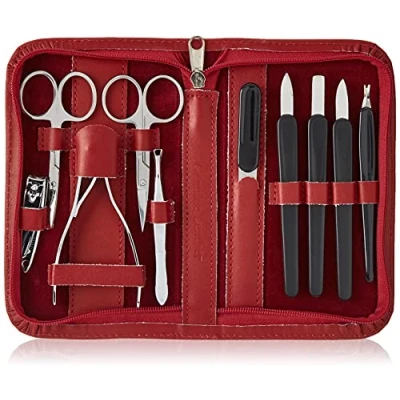 10-pcs manicure set with zipper Stainless steel instruments Tweeser, sapphire file, nail scissors, cuticle scissors, nail nipper, nail clipper and 4 instruments Leather case Colour: red
