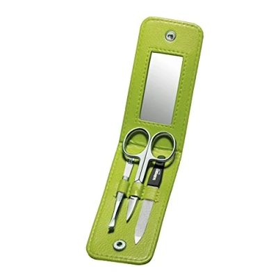 Practical 3-part clauss manicure case of real leather with mirror Sapphire file with coarse and fine graining Engled tweezers Nail scissors Colour: green