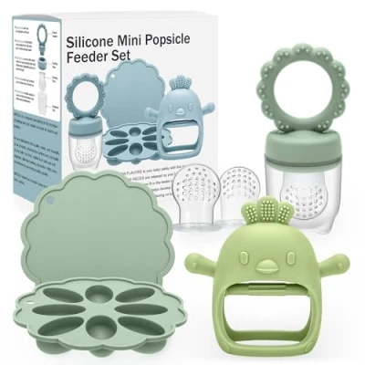 Prioritizing Quality & Safety: Trust in our baby care products that are meticulously designed to be free from BPA, PVC, and phthalates, ensuring a safe feeding experience for your precious little one at every meal. More Convenient - Baby Food: You can put breastmilk, purees, juices or some baby food to freeze, then put the frozen pieces into feeder, including the option to create nutritious breastmilk popsicles for teething relief Soothe Baby Sore Teether:Imitate pacifier&nipple shape, and the soft silicone touch point massage granules privide the teething pain relief and satisfy different bite experiences. the cute chick glove silicone teether improve baby's teeth occlusion ability, it will helps gum stimulation and teeth growth Versatile & Innovative: Small tray freezes the perfect size pieces that fit perfectly into the food feeder, great for teething and self feeding. Save time and prepare meals in advance with our convenient baby food freezer tray, making homemade food storage effortless Essential Baby Feeding & Teething Kit: This baby kit includes 1 baby food freezer tray, 1 pacifier feeders, 1 silicone teether toy, 2 extra silicone nipples, simplifying feeding and teething needs. Ensuring convenience and efficiency for modern parents