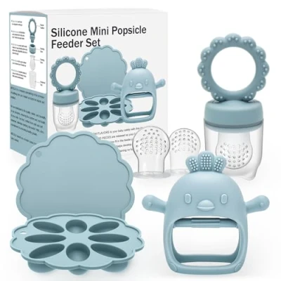 Amazon Prioritizing Quality & Safety: Trust in our baby care products that are meticulously designed to be free from BPA, PVC, and phthalates, ensuring a safe feeding experience for your precious little one at every meal. More Convenient - Baby Food: You can put breastmilk, purees, juices or some baby food to freeze, then put the frozen pieces into feeder, including the option to create nutritious breastmilk popsicles for teething relief Soothe Baby Sore Teether:Imitate pacifier&nipple shape, and the soft silicone touch point massage granules privide the teething pain relief and satisfy different bite experiences. the cute chick glove silicone teether improve baby's teeth occlusion ability, it will helps gum stimulation and teeth growth Versatile & Innovative: Small tray freezes the perfect size pieces that fit perfectly into the food feeder, great for teething and self feeding. Save time and prepare meals in advance with our convenient baby food freezer tray, making homemade food storage effortless Essential Baby Feeding & Teething Kit: This baby kit includes 1 baby food freezer tray, 1 pacifier feeders, 1 silicone teether toy, 2 extra silicone nipples, simplifying feeding and teething needs. Ensuring convenience and efficiency for modern parents
