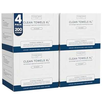 Clean Skin Club Towels XL, 100% USDA Biobased Dermatologist Approved Face Towel, Disposable Clinically Tested Towelette, Makeup Remover Dry Wipes, Ultra Soft, 200 ct, 4 pack