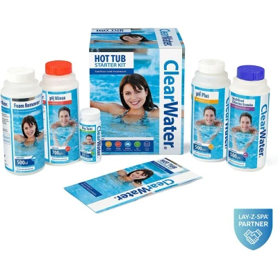 - Keep your hot tub water clean and clear with this Lay-Z-Spa Clearwater spa starter kit - The fast-acting chlorine granules kill off bacteria and disinfect the water in no time - Balance your water with pH Plus and pH Minus, so every soak feels just right - Use the foam remover to clear away surface bubbles when the jets are on - The dip test strips help you check your water quality in seconds