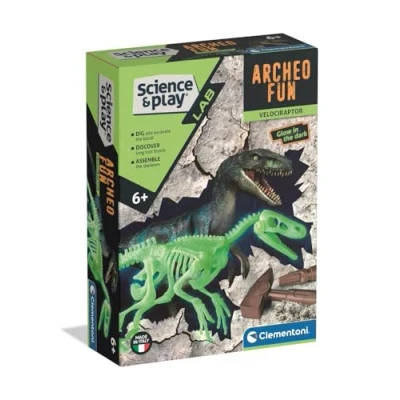The Velociraptor, the legendary prehistoric creature comes to life again in this toy for real palaeontologists! The hammer and chisel are ideal tools to carve the brick and unearth the skeleton of this incredible dinosaur! The skeleton lights up in the dark Made in Italy No need batteries, Manufacturer: Clementoni