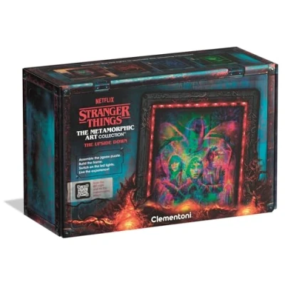 AmazonTRANSFORM YOUR ROOM INTO THE UPSIDE DOWN: Assemble the interactive artwork, complete the 520-piece puzzle inside, turn off the lights, and activate the LED strip to reveal multiple scenes inspired by Stranger Things. EXPERIENCE THE STORY IN MOTION: The image transforms thanks to multiple coloured layers - Eleven, her friends, and the Mind Flayer appear depending on the light. An immersive visual experience for true fans. ALL-IN-ONE KIT: Includes the puzzle (49 x 36 cm), a frame to assemble, glue, a poster, the LED unit and bright LED light, and instructions — everything you need to build and display your masterpiece. A UNIQUE GIFT FOR STRANGER THINGS LOVERS: More than just artwork, this piece changes the atmosphere when you dim the lights. Perfect for collectors and fans of the series. PART OF THE EXCLUSIVE METAMORPHIC ART COLLECTION: Discover other scenes from the series and bring home your favourite Hawkins moments with interactive paintings that glow in the dark., Manufacturer: Clementoni