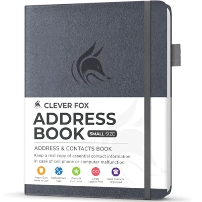 KEEP TRACK OF CONTACTS - Clever Fox Address Book with tabs promotes convenient contact organization, making sure you write down and safely store names, phone numbers, emails, and addresses of your acquaintances. ORGANIZED & SAFE - This telephone and address book has alphabetical A-Z tabs to minimize time spent searching for any particular contact. At the back of the medium sized address book organizer, you will find space for important phone numbers and dates. ALL INFORMATION IN ONE PLACE - This Logbook has space for all contact information you may need, such as the contact's name, address, phone, email, and notes. POCKET FORMAT & PREMIUM QUALITY – This mini address book for women and men measures 10.5 x 14 cm, and has an eco-leather hardcover, thick 120gsm paper, elastic, pen loop, bookmark, lay-flat binding, and pocket for loose notes and contact cards. 60-DAY MONEY-BACK GUARANTEE – We will exchange or refund your medium sized address book if you aren’t satisfied with your address book organizer for any reason. Reach out to us via message to refund your PU leather address book.
