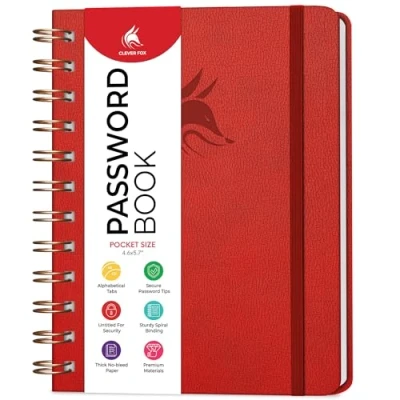 FIND ANY PASSWORD YOU NEED EASILY: Tired of wasting precious time remembering the right password? With Clever Fox Spiral Password Book, you can record up to 440 passwords and organize them alphabetically, so you can find any password you need in no time. TAKE YOUR INTERNET SAFETY TO THE NEXT LEVEL: Every day, hackers come up with new ways to steal valuable data stored digitally. This password keeper book is an effective way to keep your login details offline, so no hacker can ever reach them. Moreover, you can now create unique, complex passwords for each account without risking forgetting them. LAMINATED TABS, SPIRAL BINDING & OTHER FEATURES: This password journal has convenient letter tabs to easily locate any information you need. The tabs are laminated to ensure they withstand daily wear and tear. Durable double wire binding helps you flip the pages effortlessly and write comfortably wherever you are. The internet password book with tabs also features a convenient elastic band to keep the pages together, plenty of lined pages to add extra notes, and a back pocket for loose papers. MADE TO LAST WITH PREMIUM-QUALITY MATERIALS: We ensure this password organizer lasts a lifetime using only premium-quality materials. The password manager has a soft-touch vegan leather hardcover and thick 120gsm paper that is bleed- and smudge-resistant. The password log book comes in pocket format and measures only 12 by 14.5cm, so you can carry your mini password book in a purse and use it on the go. GUARANTEE & RETURNS – We hope that our small password book with alphabetical tabs will help you store and use your login details efficiently. Otherwise, we will happily exchange or refund your internet address and password logbook if you are having any quality issues or are not completely satisfied with your pasword keeper book for any other reason. Reach out to us via an Amazon message for an easy refund of this password notebook with alphabetical tabs.