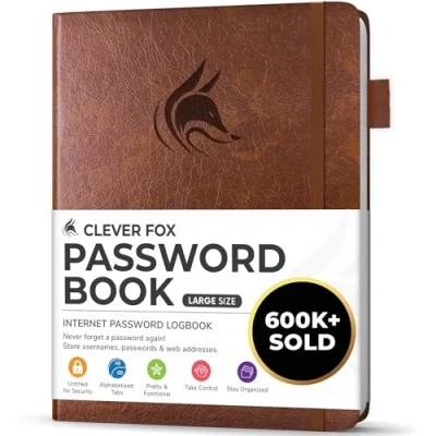NEVER FORGET A PASSWORD AGAIN - Clever Fox password journal will help you create secure passwords and keep them safe and organized. This password book allows you to store all your passwords and other computer information in one place to find it easily. ALPHABETICAL A-Z TABS - Alphabetic tab system makes it easy to find any password you need. The book also has sections for most important passwords, wireless & email settings, software license information & additional notes. ELEGANT, SMART, PRACTICAL & SECURE PASSWORD ORGANIZATION - This password keeper book has been designed to be anonymous without an obvious title on the cover. For added security there is space to write hints instead of the password itself. LARGE SIZE & PREMIUM QUALITY - This internet address and password logbook with tabs comes in large size (18 x 25 cm). The password notebook has an eco-leahter hardcover, elastic band, pen loop, bookmark, pocket for notes, and thick 120gsm paper. 60-DAY MONEY-BACK GUARANTEE - We will exchange or refund your password organizer if you aren’t satisfied with your password organization for any reason. Reach out to us via message to refund your internet password logbook.