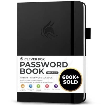 NEVER FORGET A PASSWORD AGAIN - Clever Fox password journal will help you create secure passwords and keep them safe and organized. This password book allows you to store all your passwords and other computer information in one place to find it easily. ALPHABETICAL A-Z TABS - Alphabetic tab system makes it easy to find any password you need. The book also has sections for most important passwords, wireless & email settings, software license information & additional notes. ELEGANT, SMART, PRACTICAL & SECURE PASSWORD ORGANIZATION - This password keeper book has been designed to be anonymous without an obvious title on the cover. For added security there is space to write hints instead of the password itself. MEDIUM SIZE & PREMIUM QUALITY - This internet address and password logbook with tabs comes in medium size (13.5 x 19 cm). The password notebook has an eco-leahter hardcover, elastic band, pen loop, bookmark, pocket for notes, and thick 120gsm paper. 60-DAY MONEY-BACK GUARANTEE - We will exchange or refund your password organizer if you aren’t satisfied with your password organization for any reason. Reach out to us via message to refund your internet password logbook.