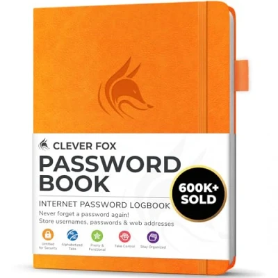 NEVER FORGET A PASSWORD AGAIN - Clever Fox password journal will help you create secure passwords and keep them safe and organized. This password book allows you to store all your passwords and other computer information in one place to find it easily. ALPHABETICAL A-Z TABS - Alphabetic tab system makes it easy to find any password you need. The book also has sections for most important passwords, wireless & email settings, software license information & additional notes. ELEGANT, SMART, PRACTICAL & SECURE PASSWORD ORGANIZATION - This password keeper book has been designed to be anonymous without an obvious title on the cover. For added security there is space to write hints instead of the password itself. POCKET SIZE & PREMIUM QUALITY - This internet address and password logbook with tabs comes in pocket size (10.5 x 14 cm). The password notebook has an eco-leahter hardcover, elastic band, pen loop, bookmark, pocket for notes, and thick 120gsm paper. 60-DAY MONEY-BACK GUARANTEE - We will exchange or refund your password organizer if you aren’t satisfied with your password organization for any reason. Reach out to us via message to refund your internet password logbook.