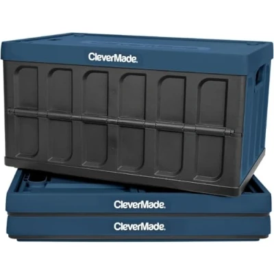 CleverMade 62L Collapsible Storage Bins with Lids Folding Plastic Stackable Utility Crates, Solid Wall 3 Pack, Ocean
