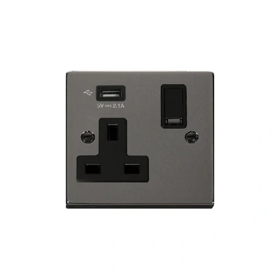 Click Deco 13A 1G Switched Socket with Single 2.1A USB Black Nickel Insert
