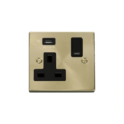 Click Deco 13A 1G Switched Socket with Single 2.1A USB Satin Brass Insert Black