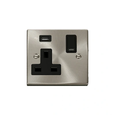 Click Deco 13A 1G Switched Socket with Single 2.1A USB Satin Chrome Insert Black