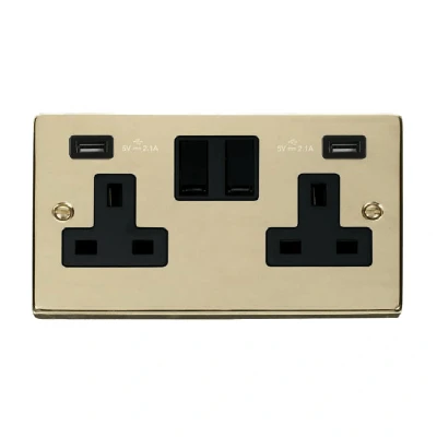 Click Deco 13A 2G Switched Socket with Twin 2.1A USB Outlets Polished Brass Insert Black