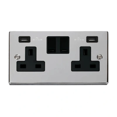 Click Deco 13A 2G Switched Socket with Twin 2.1A USB Outlets Polished Chrome Insert Black
