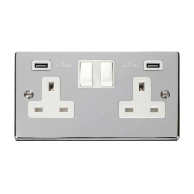 Click Deco 13A 2G Switched Socket with Twin 2.1A USB Outlets Polished Chrome Insert White