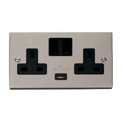 Click Deco 13A 2G Switched Socket With USB Outlet Pearl Nickel Insert Black