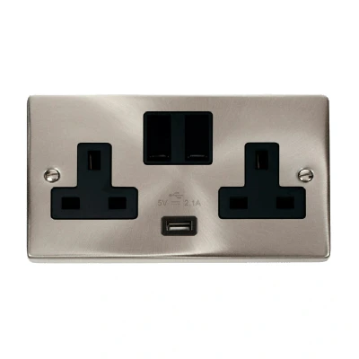 Click Deco 13A 2G Switched Socket With USB Outlet Satin Chrome Insert Black